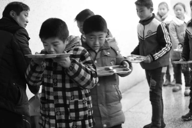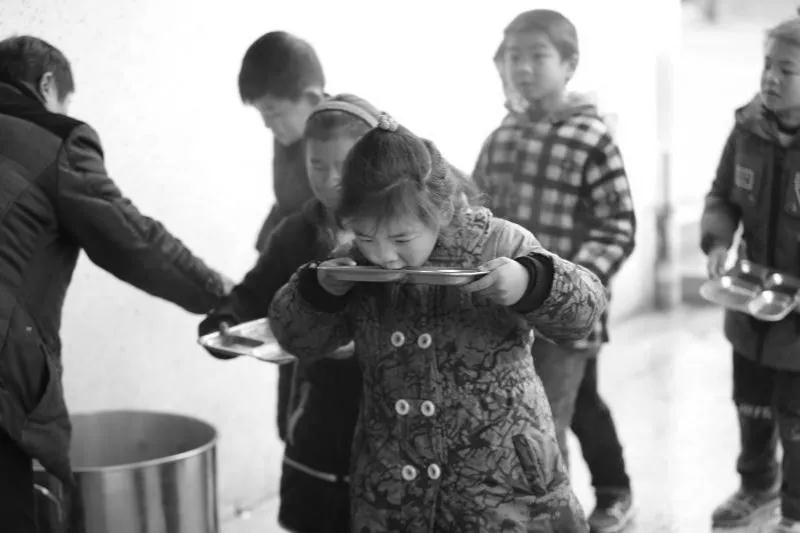 ▲孩子排隊用餐具等著老師給打水(未安裝凈水設備的學校)