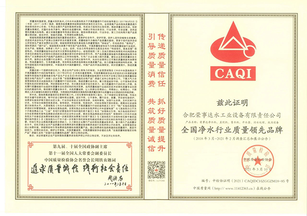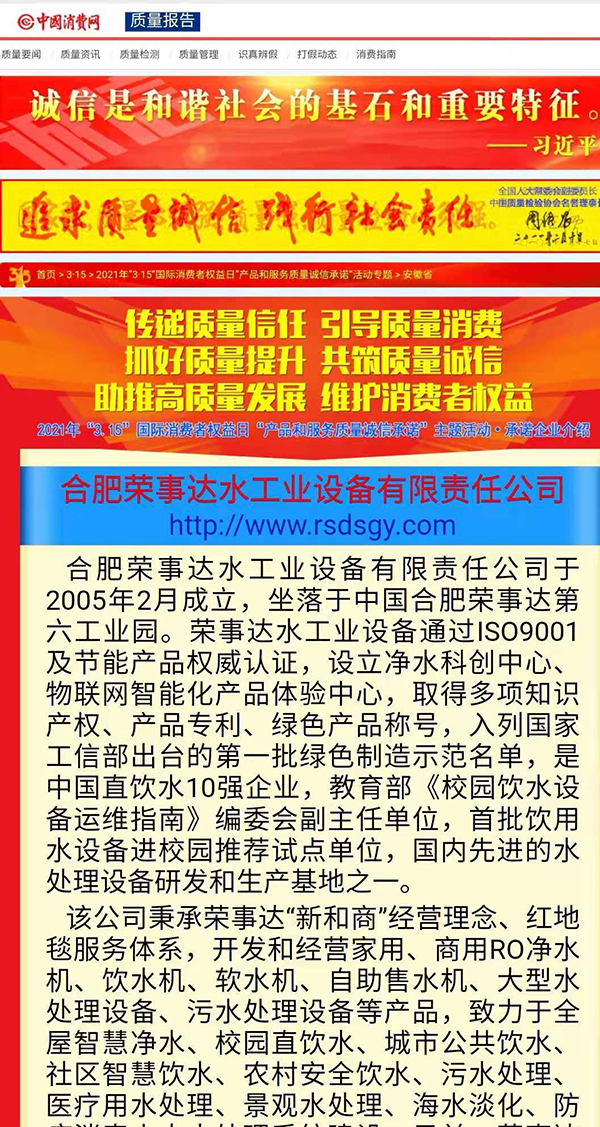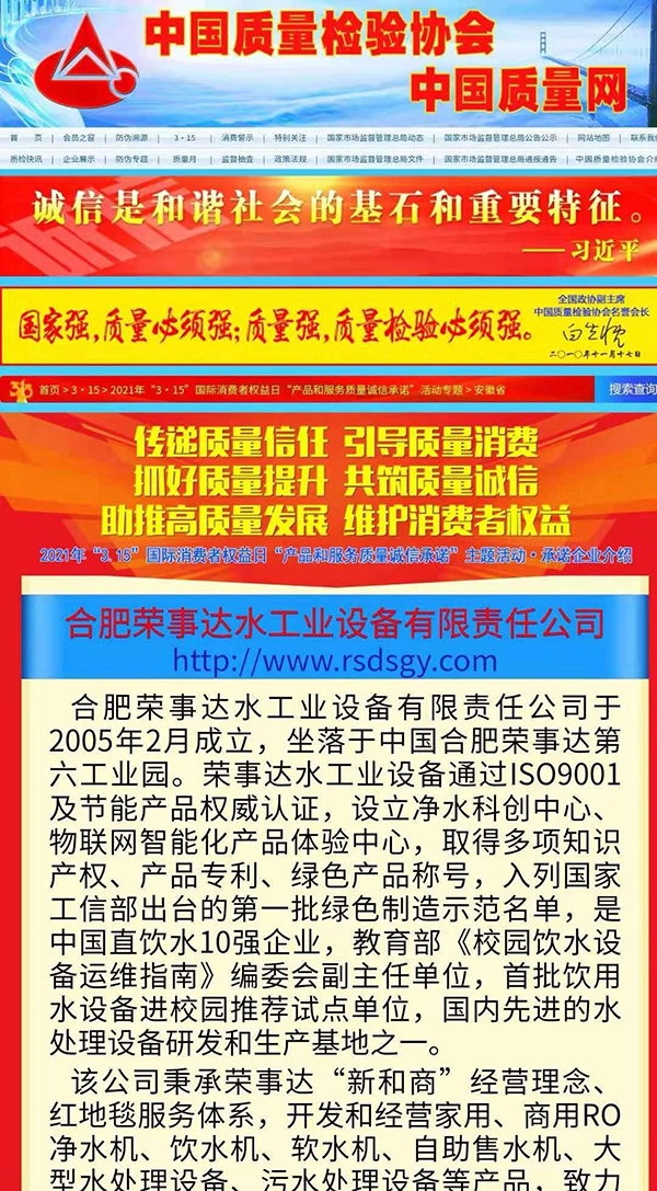 共筑質(zhì)量誠信,引導(dǎo)質(zhì)量消費(fèi)。在由中國質(zhì)量檢驗協(xié)會主辦的2021年“3.15”產(chǎn)品和服務(wù)質(zhì)量誠信承諾的主題活動中,榮事達(dá)憑借卓越的產(chǎn)品品質(zhì)及良好的社會形象,獲得協(xié)會以及權(quán)威專家的一致認(rèn)可,榮膺 “全國產(chǎn)品和服務(wù)質(zhì)量誠信示范企業(yè)”“全國質(zhì)量信得過產(chǎn)品”“全國凈水行業(yè)質(zhì)量領(lǐng)先品牌” “全國質(zhì)量誠信先進(jìn)企業(yè)”多項榮譽(yù),《中國質(zhì)量報》、《中國消費(fèi)者報》及中國質(zhì)量網(wǎng)、中國經(jīng)濟(jì)網(wǎng)、中國消費(fèi)網(wǎng)等多家媒體均予以集中展示和公告。