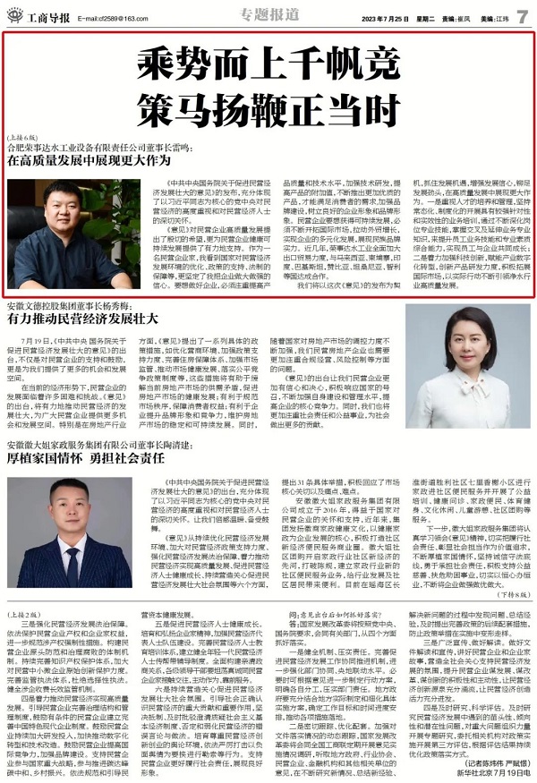 近日,《工商導(dǎo)報(bào)》報(bào)道了合肥榮事達(dá)水工業(yè)設(shè)備有限責(zé)任公司董事長雷鳴關(guān)于《中共中央國務(wù)院關(guān)于促進(jìn)民營經(jīng)濟(jì)發(fā)展壯大的意見》感悟。
