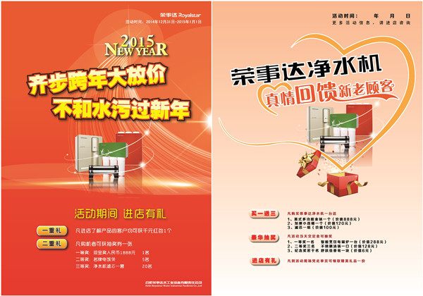 又至歲末,辭舊迎新,榮事達(dá)跨年獻(xiàn)禮,感恩回饋,再掀凈水狂潮。回首2014,居民飲水安全頻頻告急,安裝家用凈水機實現(xiàn)“純凈水自己造”,構(gòu)筑飲水安全最后一道防線,成為居民生活頭等大事。為普及凈水,元旦期間,榮事達(dá)將在全國多個省份推行惠民政策,加強推廣凈水機的力度。顧客在元旦期間進(jìn)店選購榮事達(dá)凈水機,可獲得超值大禮。逛店拿紅包——顧客進(jìn)店咨詢產(chǎn)品信息,即可獲贈千元紅包;購機送好禮——購買榮事達(dá)純水機,可獲贈管線機、凈洗機等精美大禮;歡樂抽大獎——顧客現(xiàn)場購機可參加抽獎活動,現(xiàn)金大獎、名牌家電、濾芯套裝等各項大獎送不停。開心跨年,悅享凈水。新的一年,榮事達(dá)凈水機將以更優(yōu)質(zhì)的產(chǎn)品、更好的服務(wù)加速凈水普及,真正讓惠于民,讓廣大消費者喝上安全、健康的好水,提高居民生活品質(zhì)。- [關(guān)閉] [打印]